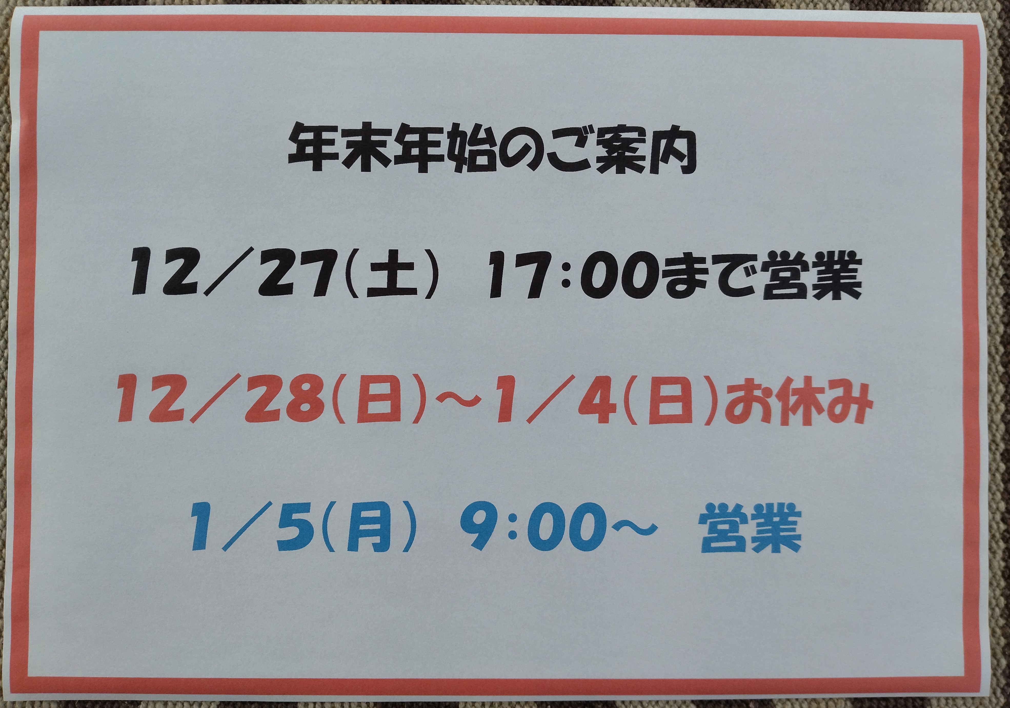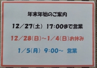 年末年始の営業日のお知らせ